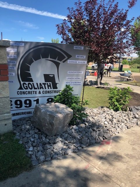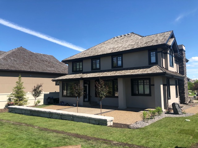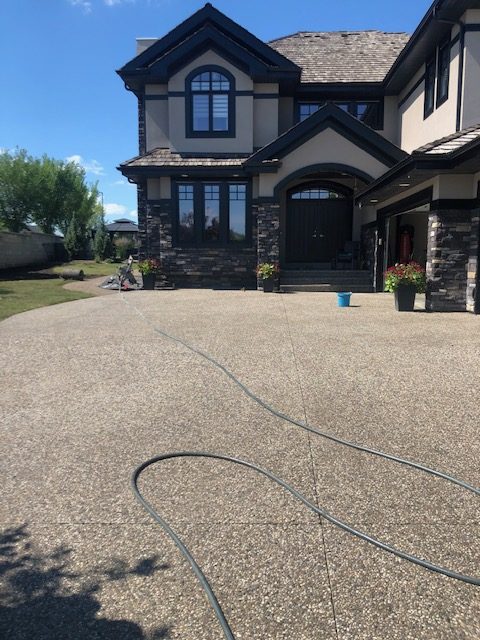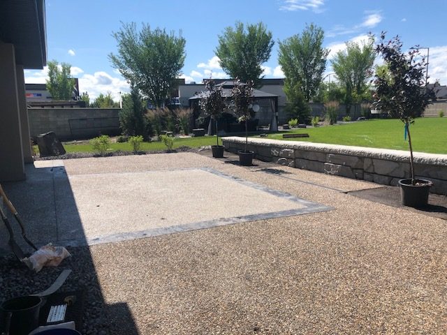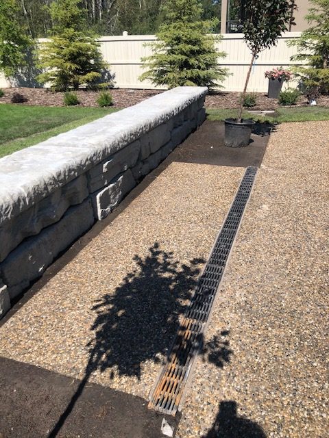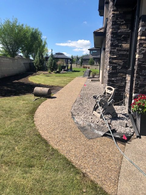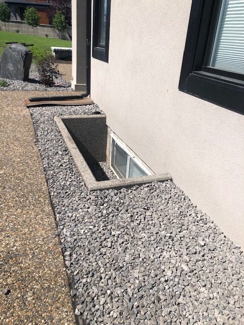 We exposed aggregate and stamped patio with a beautiful retaining concrete wall blocks (new service offered through KNelsen) to divide the yard and BBQ area, sealing of all concrete and re-sealing steps and driveway. This sealing needs to be done yearly to keep your concrete investment new and protected, and concrete sealing is another service we offer now. In addition, new concrete window wells (provided by KNelsen), and decorative rock delivered for landscaping and installed, new black dirt delivered, installed, and levelled. We also provided the new sod, and landscaping!